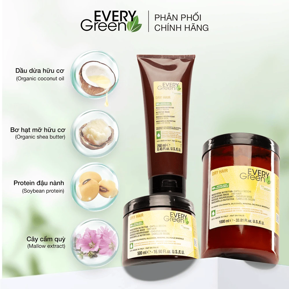 • Thành phần chính: Dầu dừa hữu cơ, Bơ hạt mỡ, Protein đậu nành, Chiết xuất cây cẩm quỳ